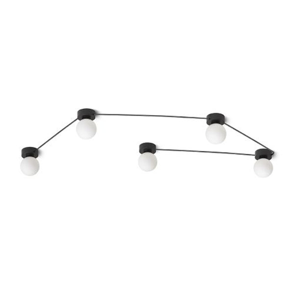 Stropné alebo nástenné svietidlá so sklenými tienidlami na čiernych lakovaných základniach, spojené čiernymi káblami v jednej línii. Svietidlá možno rozmiestniť do zoskupenia podľa svojej fantázie. Sú do nich vhodné LED svetelné zdroje s päticou G9.