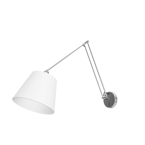 Nástenná dvojramenná lampa s textilným tienidlom a vypínačom na základni.
