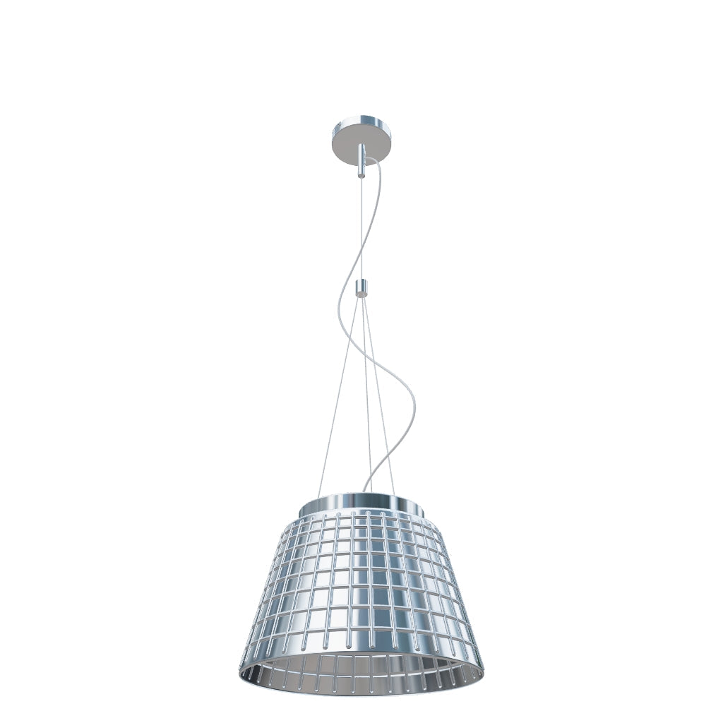 Závesné svietidlo s masívnym štruktúrovaným sklom. Sklo je z oboch strán pochrómované. Pri rozsvietení je svetelný zdroj čiastočne viditeľný.
