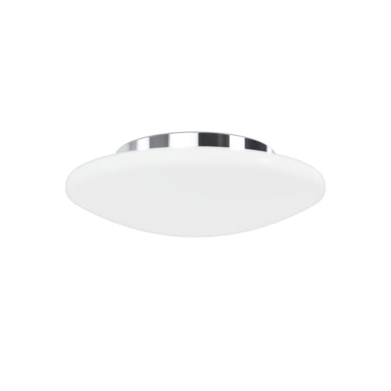 Stropné LED svietidlo z opálového skla na chrómovej základni, vhodné do vlhkého prostredia.